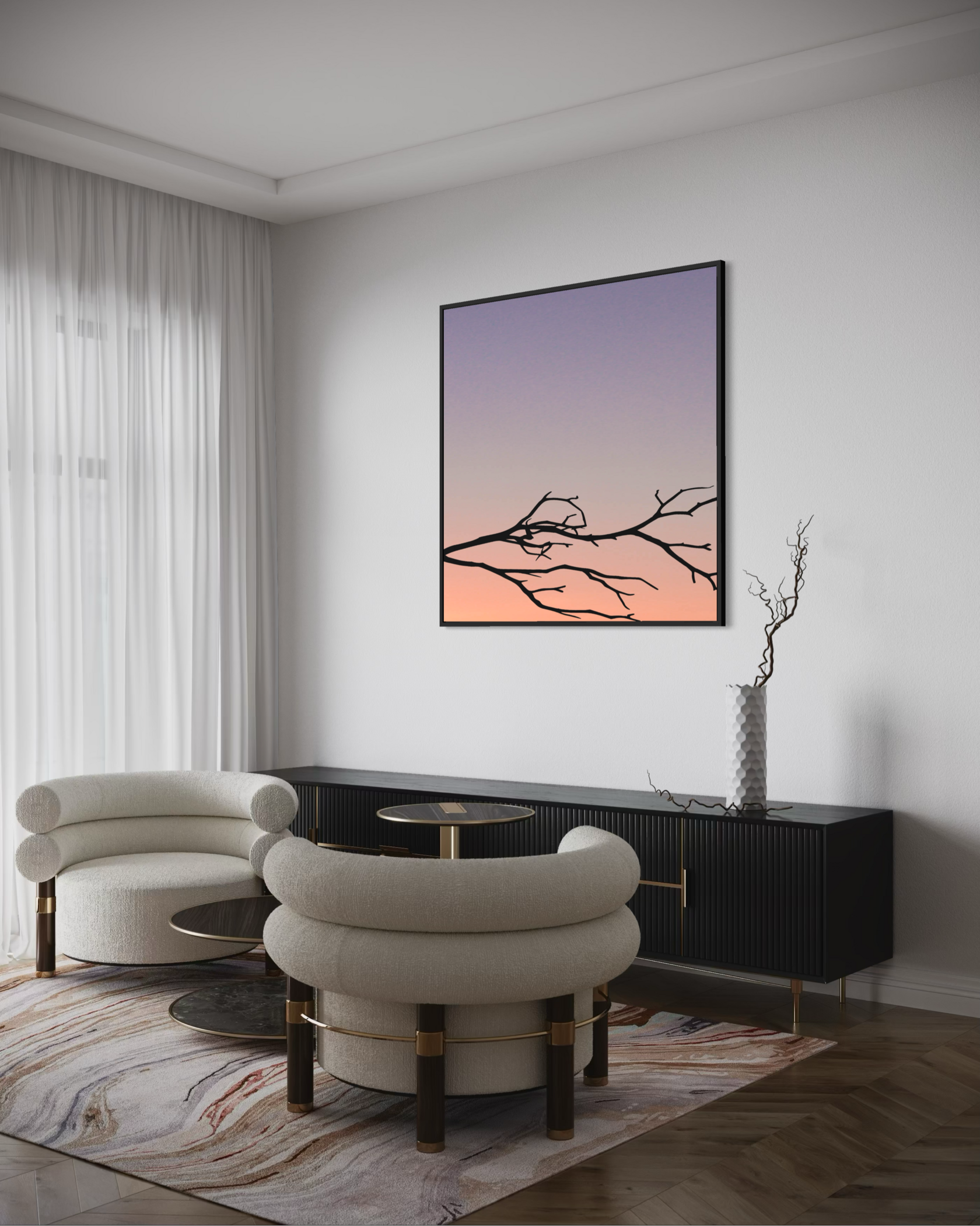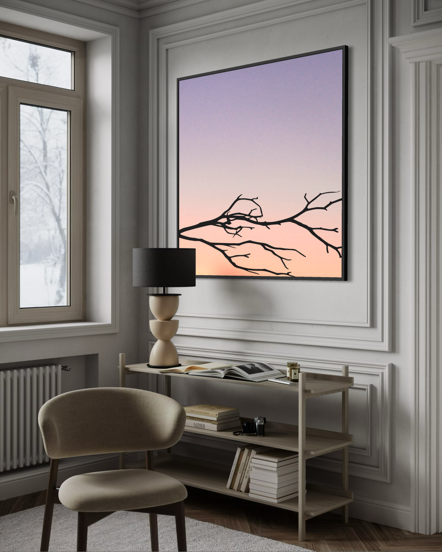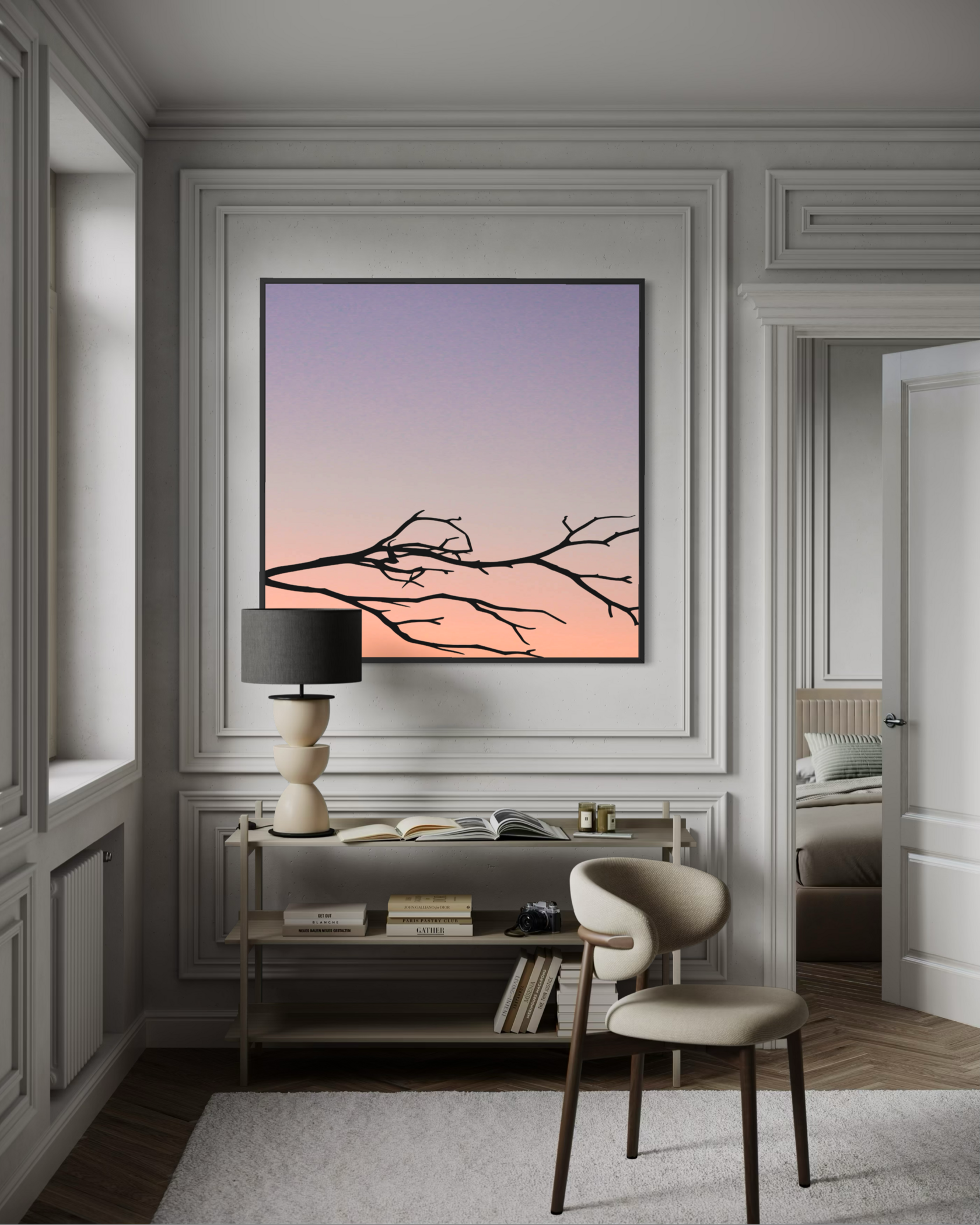 This artwork is crafted in a gentle beige palette with soft hints of blue and misty grey. Minimalistic and tranquil, it evokes a feeling of quiet elegance and inner calm. The piece integrates seamlessly into light, harmonious interiors, adding an atmosphere of subtle brightness and balanced serenity.